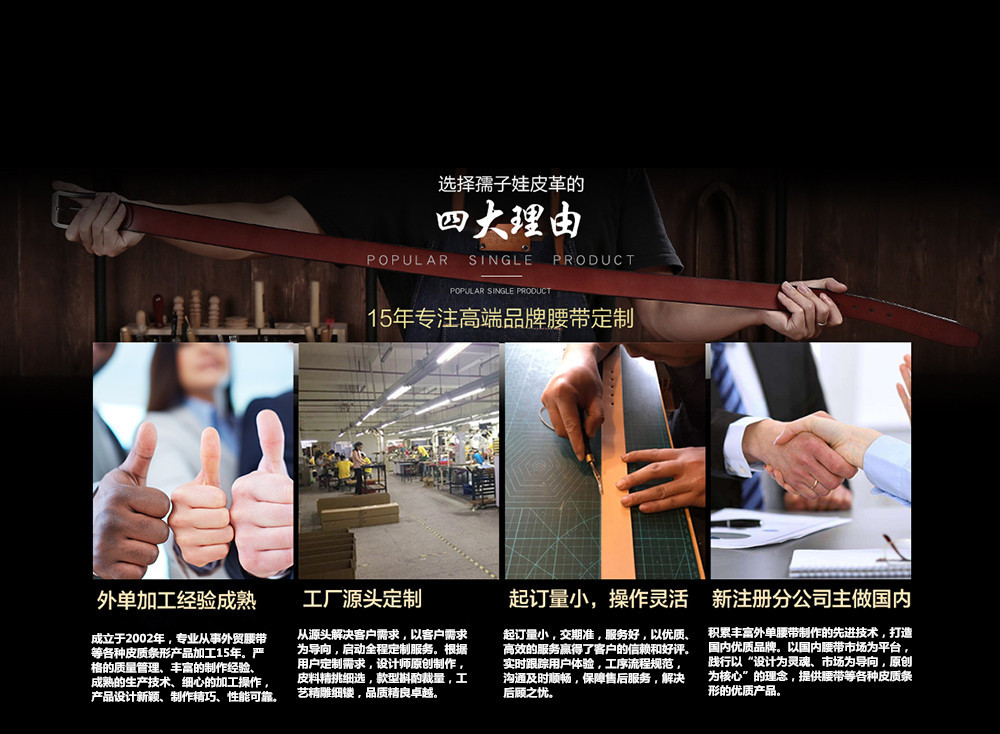 您好,歡迎來東莞市孺子娃皮革制品有限公司的網站!主營:男女真皮腰帶、寵物帶、皮具裝飾品,皮帶等多項產品生產、加工為一體