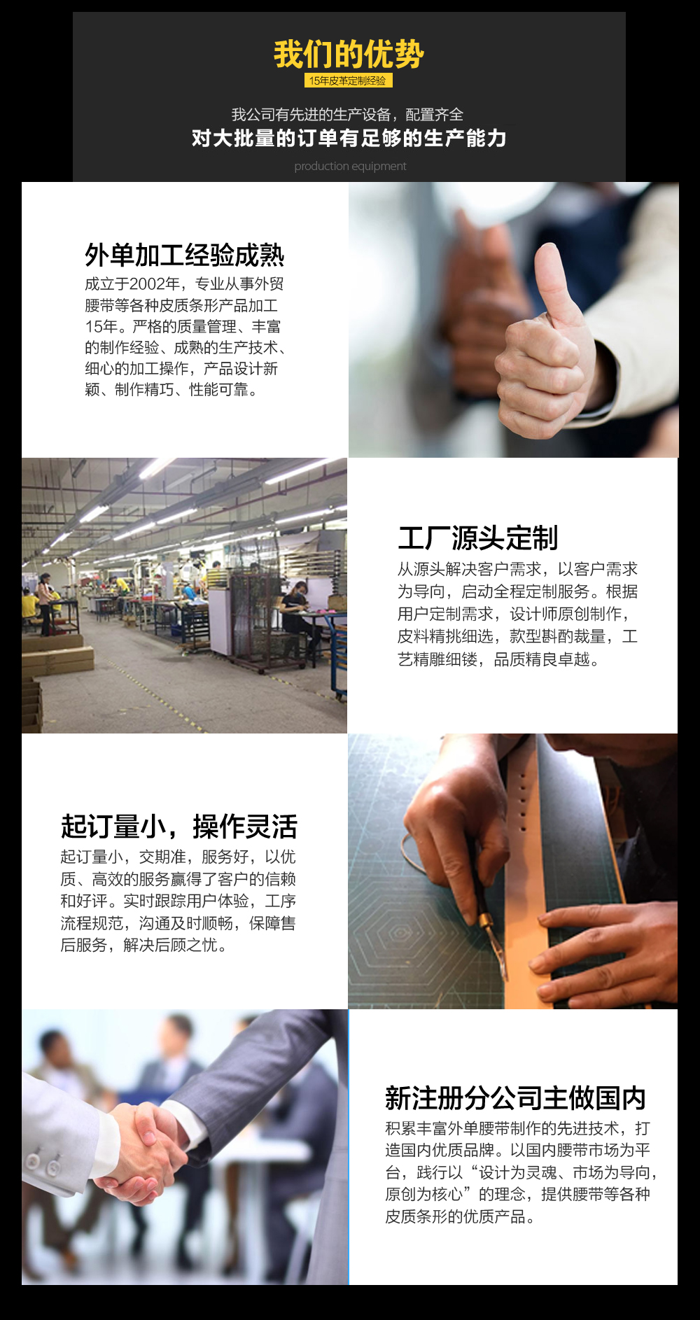 您好,歡迎來東莞市孺子娃皮革制品有限公司的網站!主營:男女真皮腰帶、寵物帶、皮具裝飾品,皮帶等多項產品生產、加工為一體